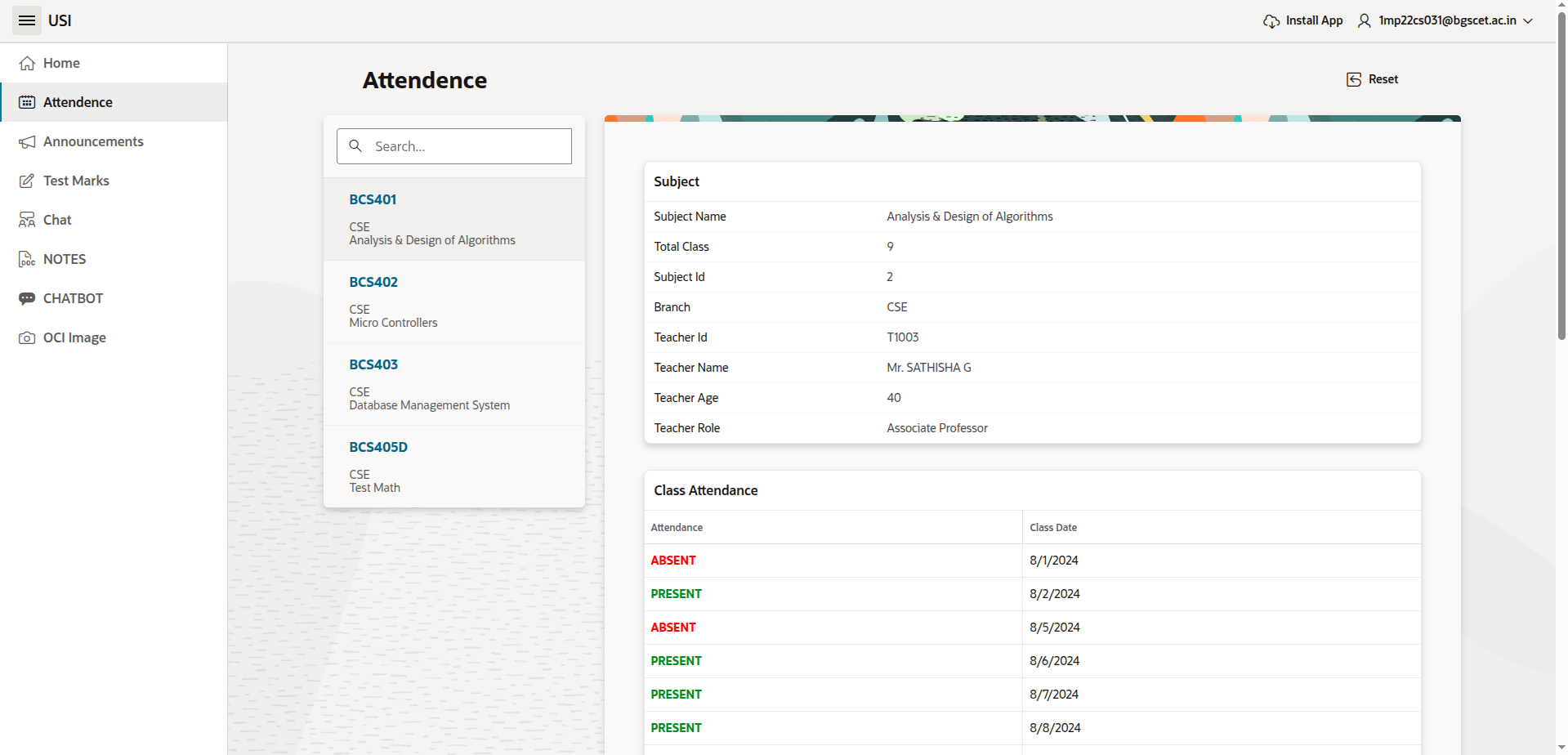 The most notable feature includes a one-click attendance feature, and test marks can be entered in just two steps from the teacher. From the students' side, they can view their attendance and marks from the app, and also a universal real-time chat feature to discuss interesting topics.
